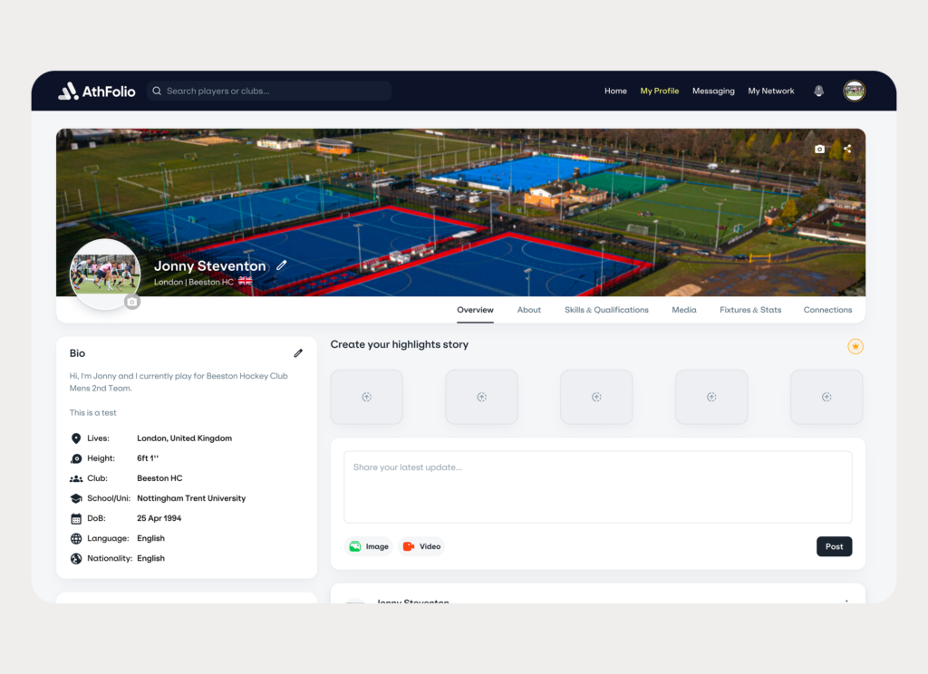 AthFolio is a sports-focused platform designed to give players and clubs a richer digital presence, combining profiles, performance data, social interaction and team structure into a single system. Built initially for field hockey, AthFolio has been designed from the outset as a scalable, sport-agnostic platform, capable of supporting additional sports, leagues, and competition formats over time.